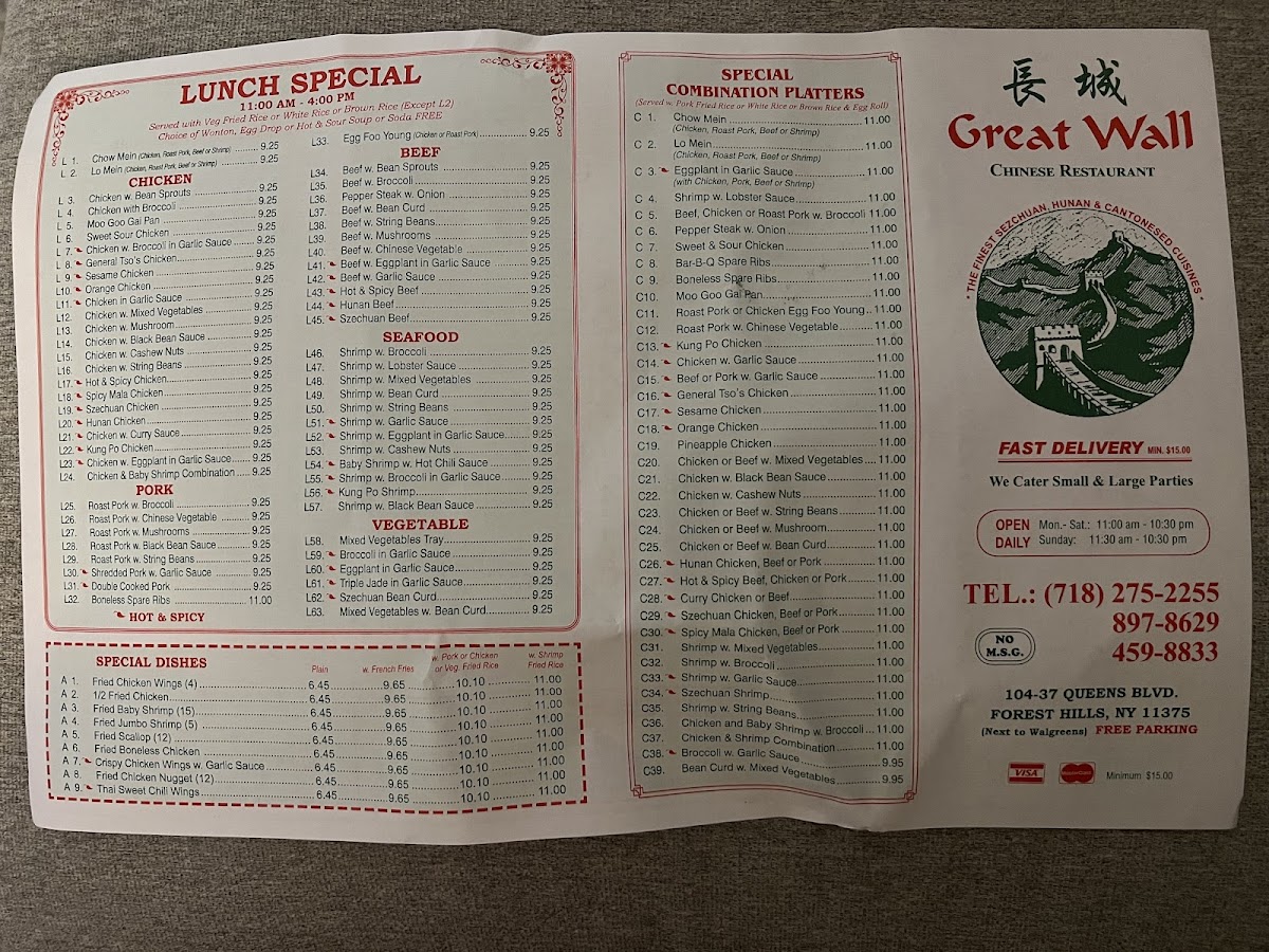 The menu at Great Wall offers a straightforward selection of familiar Chinese and Asian dishes, served in a casual and inviting setting. It’s the kind of place where you can enjoy satisfying, comforting meals that feel like a reliable choice whether you’re grabbing lunch on the go or settling in for a relaxed dinner.